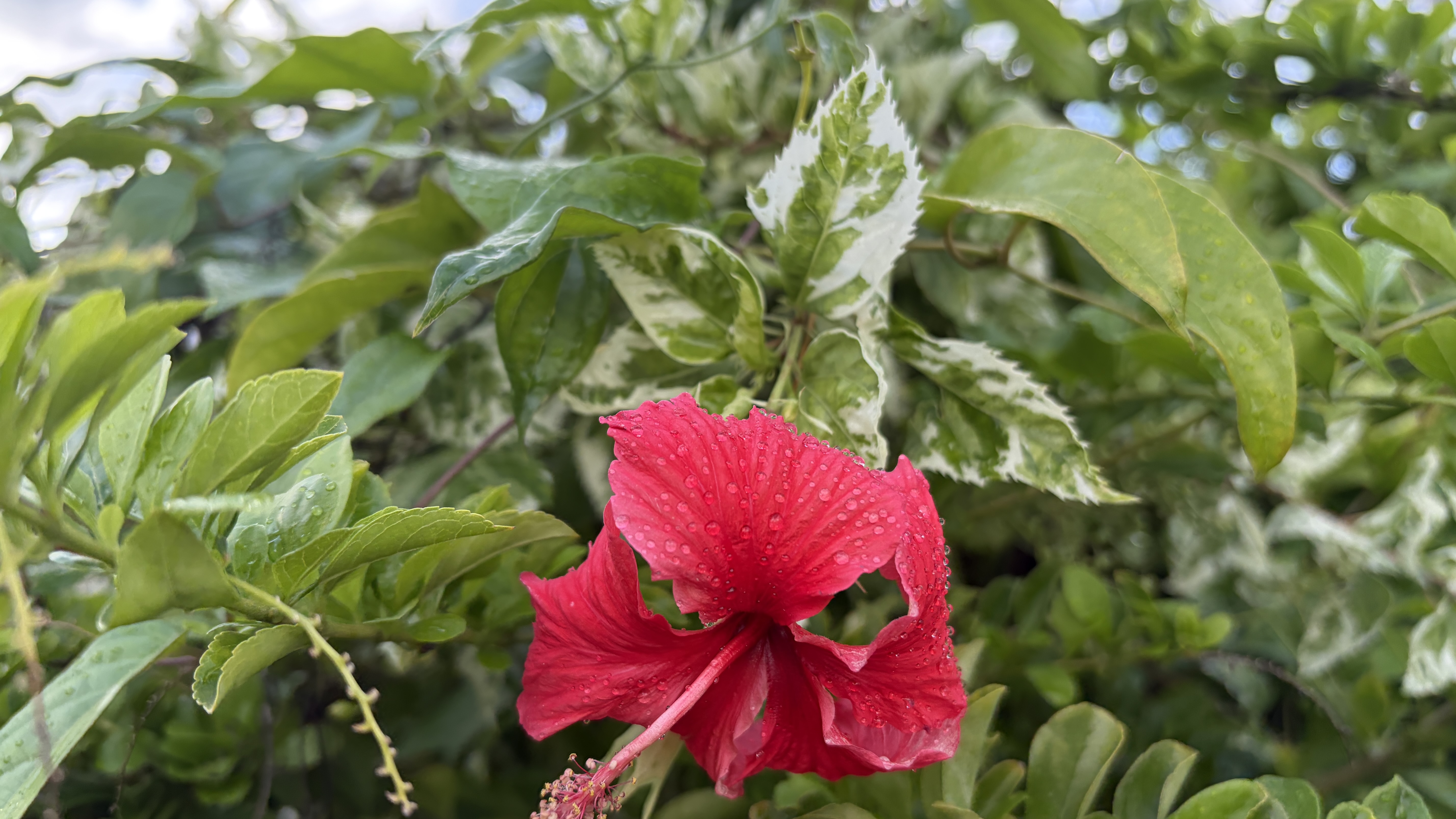 筆者の沖縄の庭では、斑入りハイビスカスが樹高2メートル近くに育ち、冬でも青々とした葉を保っています。
