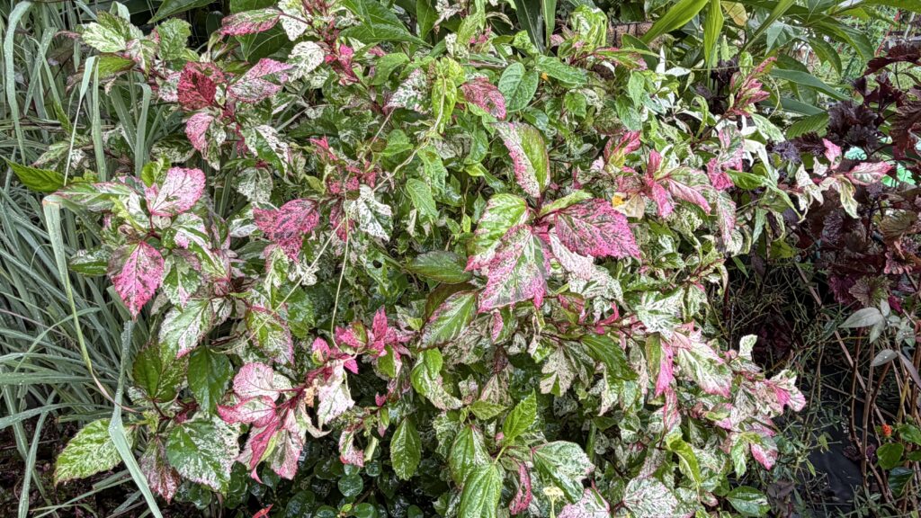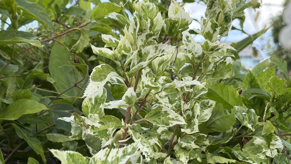 なかでも、斑入りのハイビスカスは、白や黄の模様が入った葉が美しく、